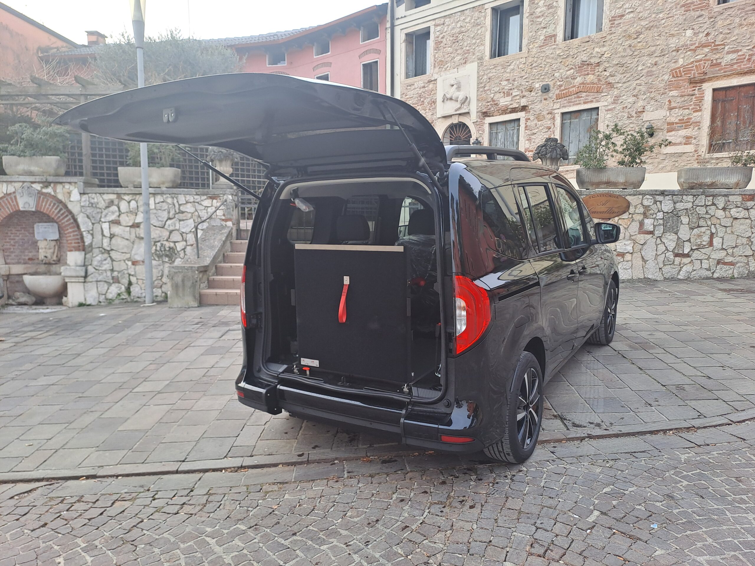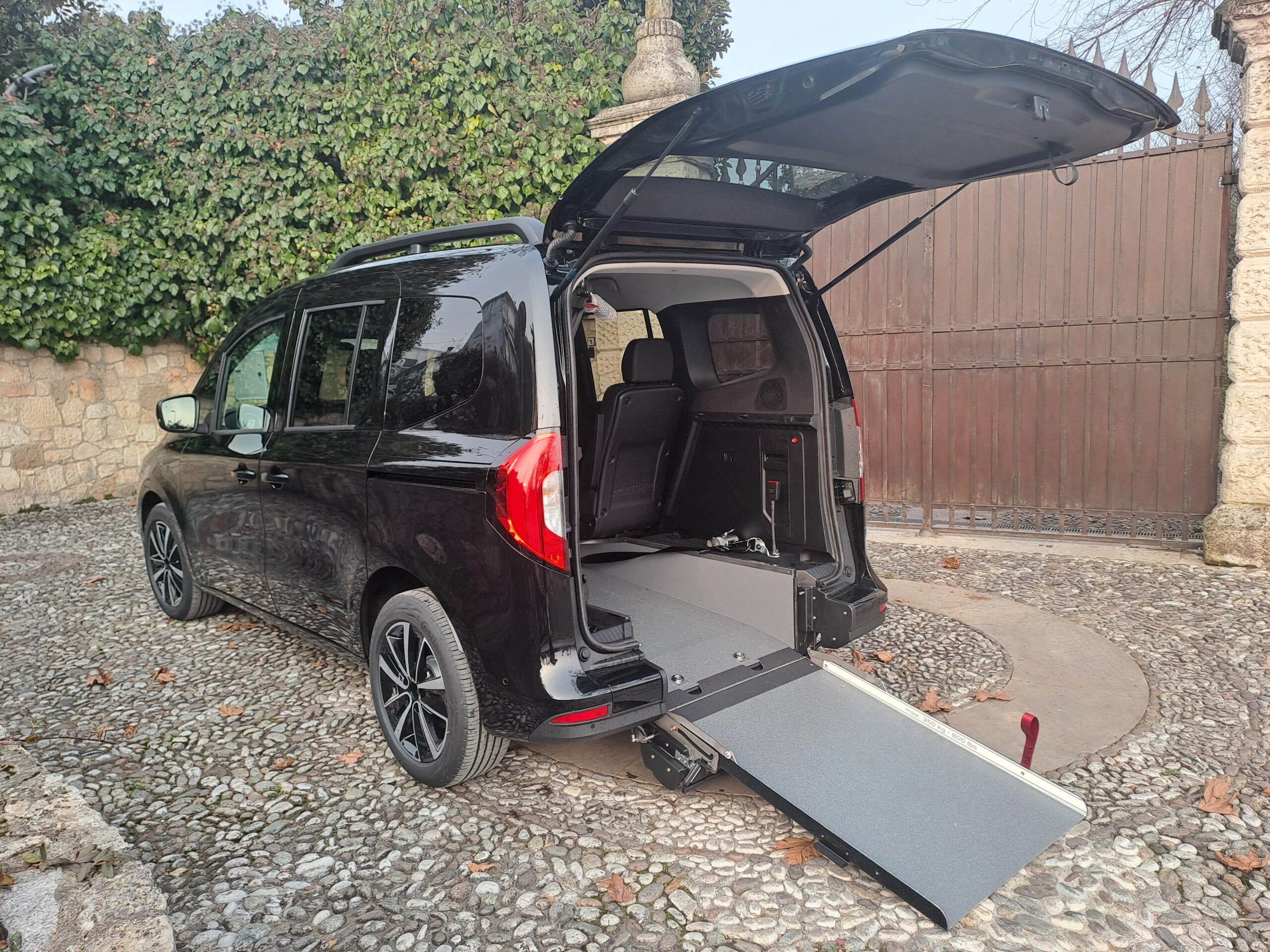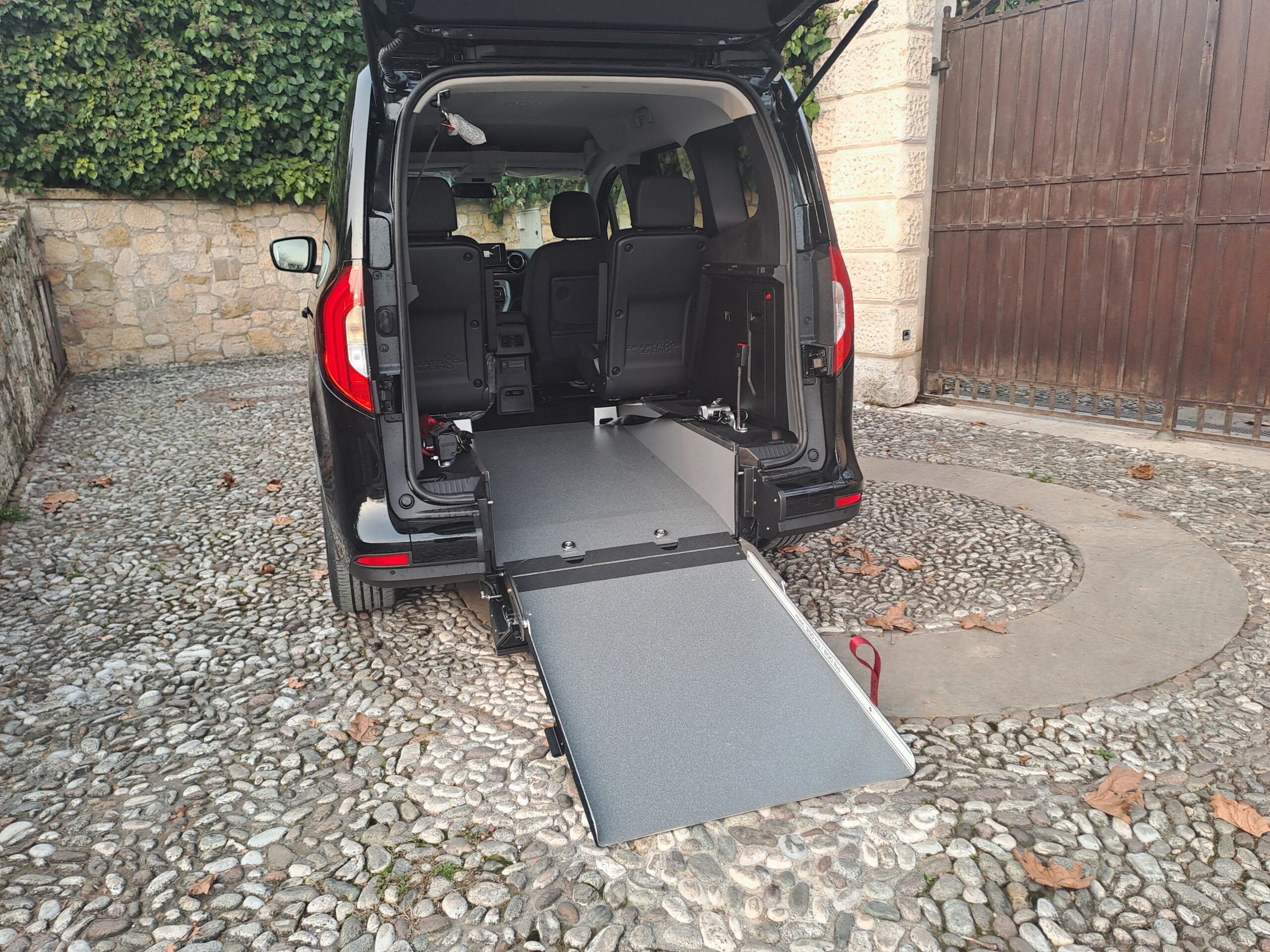 L’accesso all’interno del veicolo avviene tramite una rampa manuale o automatica, che in presenza della persona seduta rimane in verticale durante la marcia, mentre in sua assenza può essere ripiegata verso l’interno ottenendo un nuovo piano di carico.