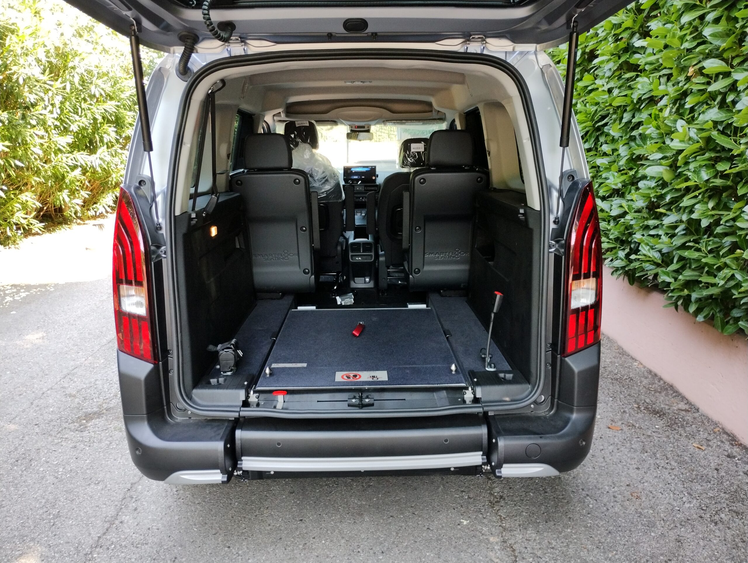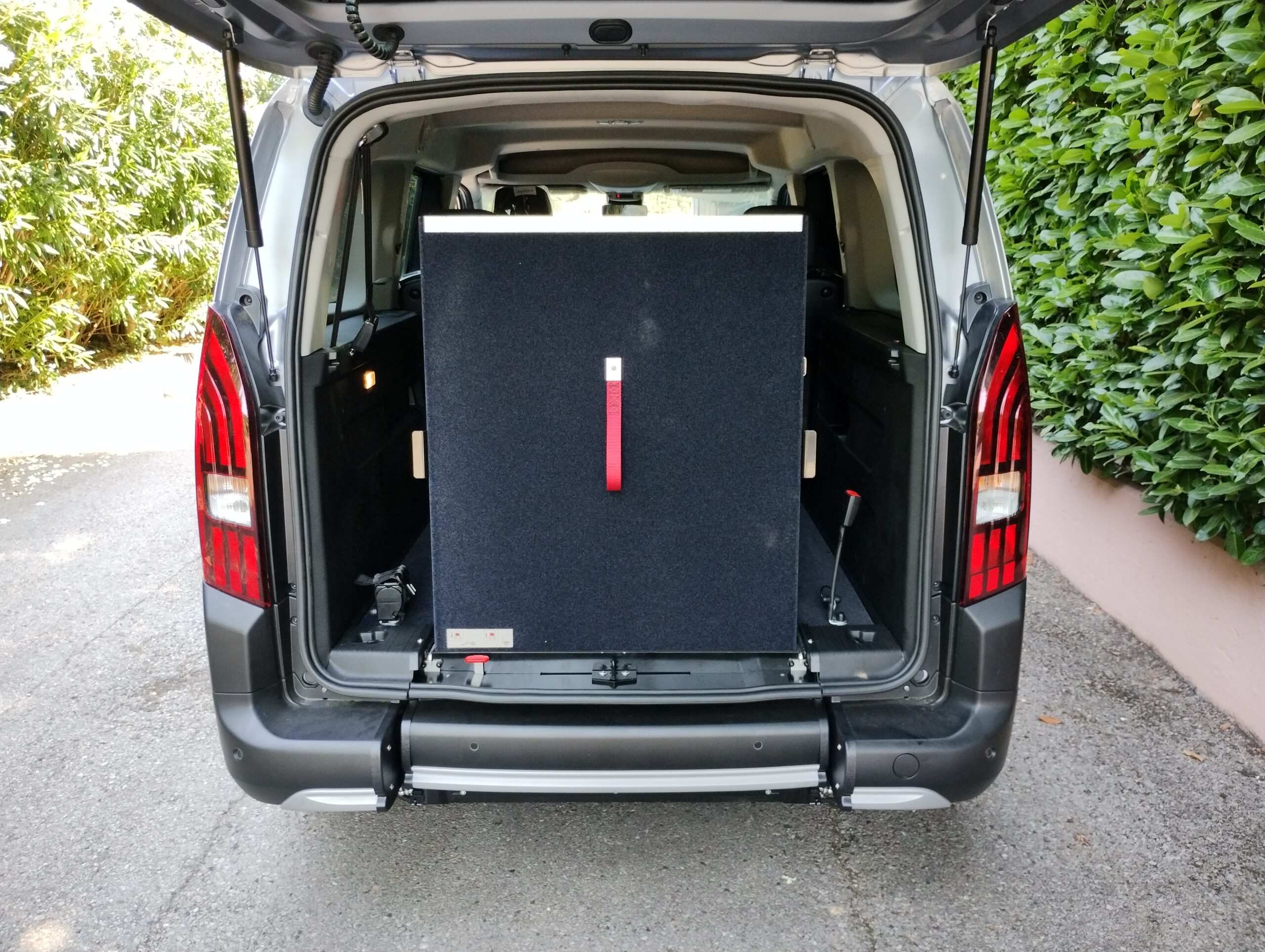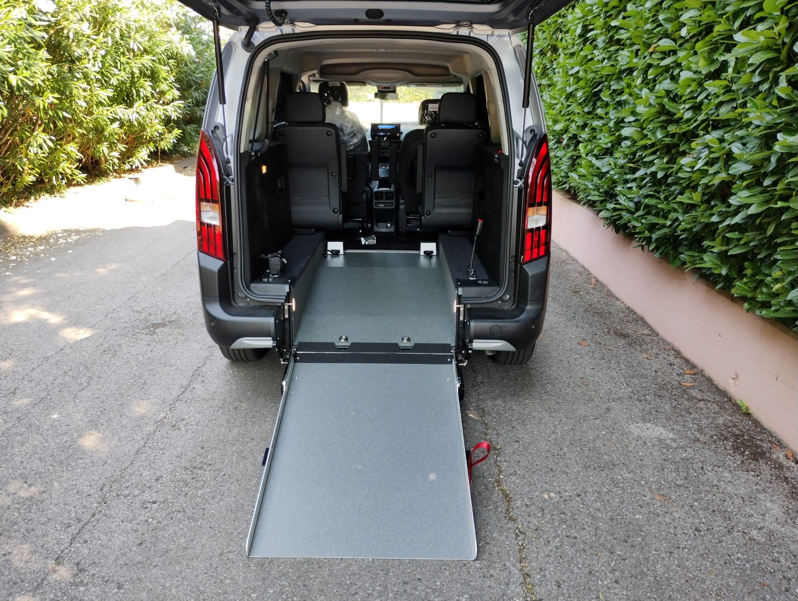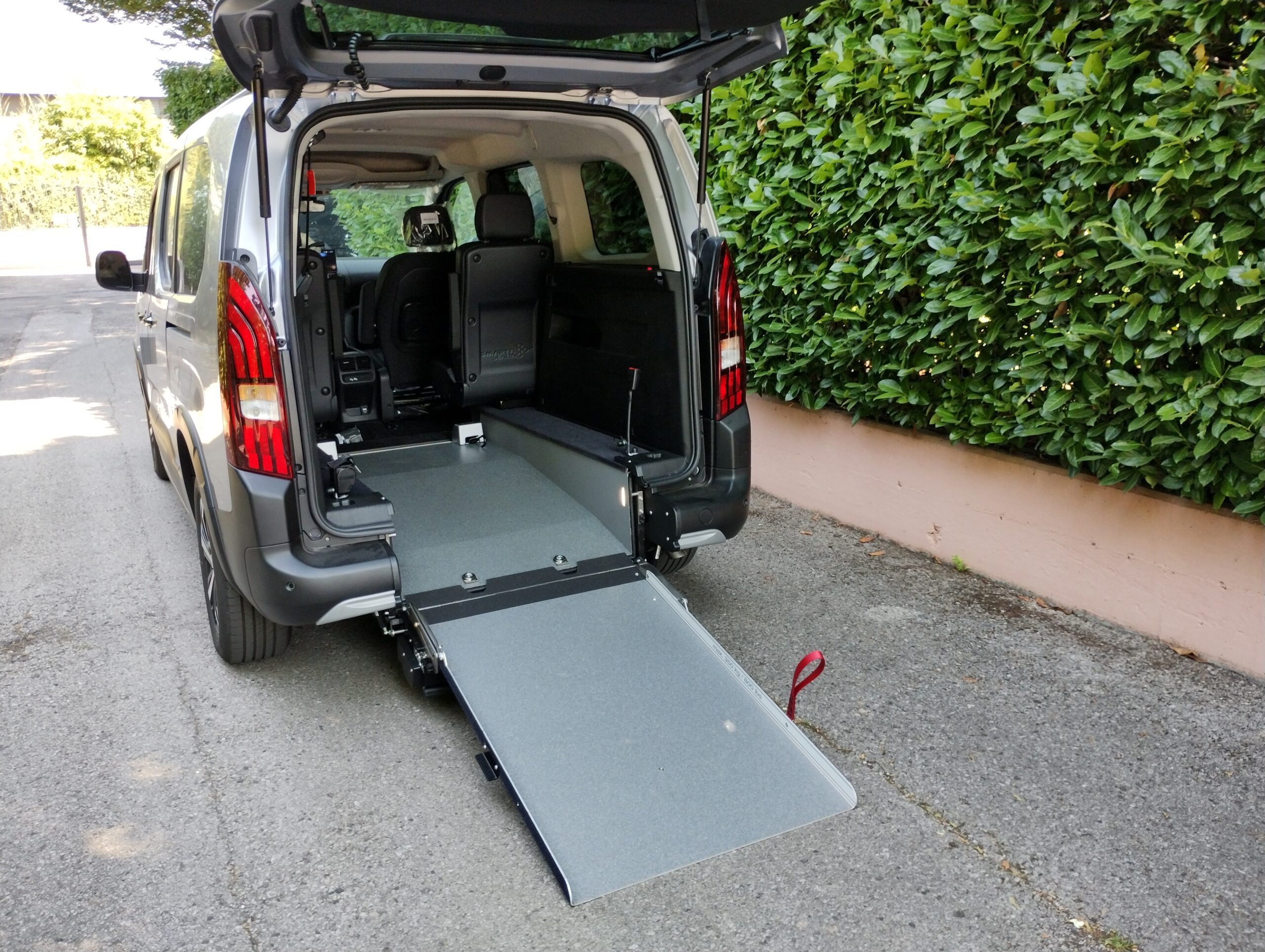 L’accesso all’interno del veicolo avviene tramite una rampa manuale o automatica, che in presenza della persona seduta rimane in verticale durante la marcia, mentre in sua assenza può essere ripiegata verso l’interno usufruendo del bagagliaio in tutto il suo spazio.